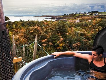 And then there’s the Elemental Spa, Goleen Harbour’s heart of warmth and relaxation. Here you’ll find a wood-fired hot tub, a solar-powered sauna, and even a cold-plunge barrel crafted from an old whiskey cask — all overlooking the Atlantic. It’s a simple but magical ritual: a sunset soak, the scent of woodsmoke, and the sound of waves echoing below. Whether you’re here for yoga, stargazing, or just to unwind, it’s a place that restores you from the inside out.